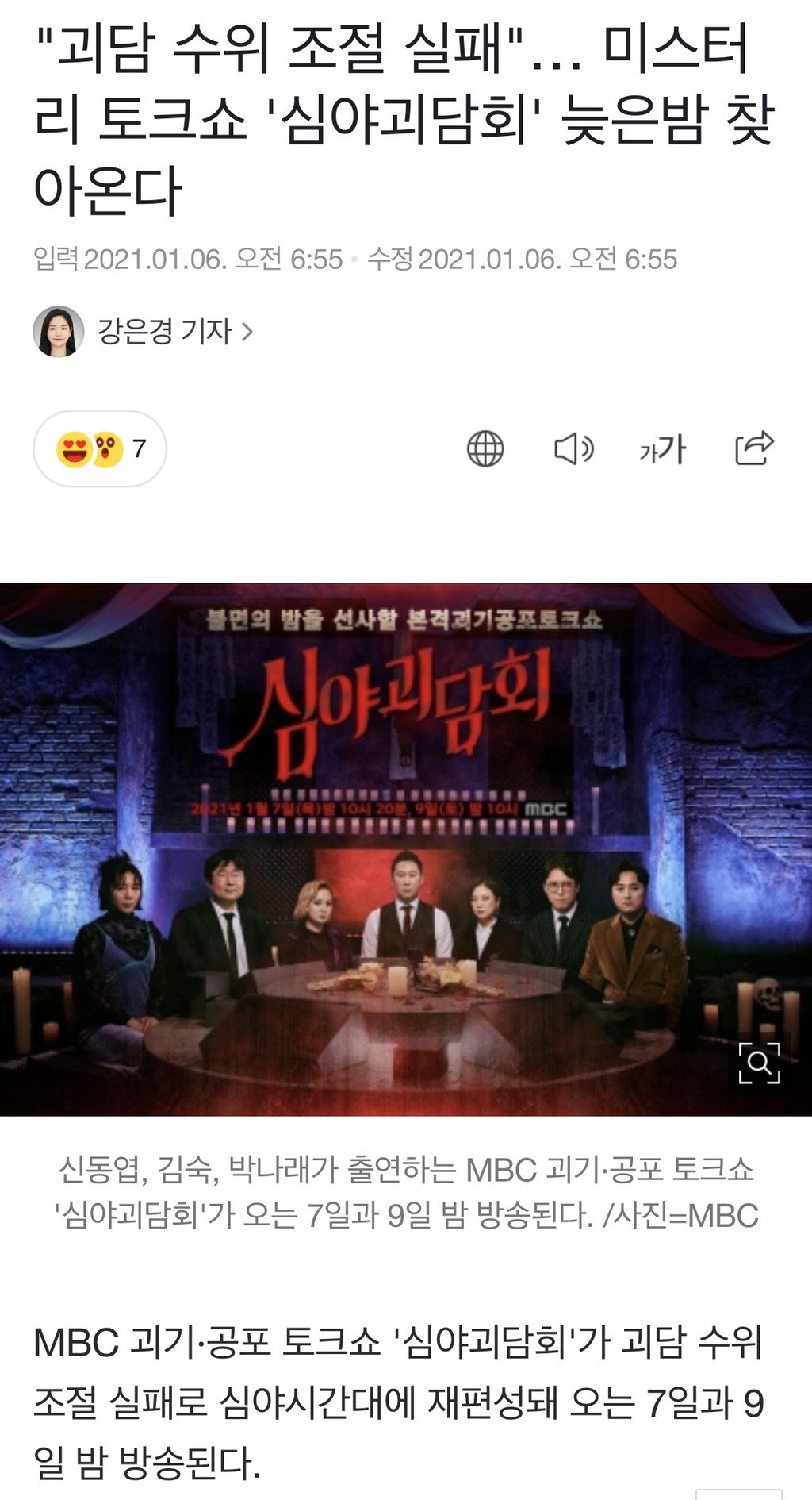 ▲ 개그맨 황제성, '심야괴담회' 합류 = 개그맨 황제성이 mbc tv 새 예능 '심야괴담회'에 합류한다. 또한 박나래는 '심야괴담회' 녹화를 통해 '내가 꿈꾸던 프로그램이다. 8일 시청률조사회사 닐슨코리아에 따르면 전날 첫 방송된 '심야괴담회'는 전국 기준 1부 1.8%, 2부. 이승철 스키장 인증샷, 시상식 타박하더니. «💉최고의 이야기꾼들이 모였다💉 2021년, 당신이 처음 만나는 공포 토크쇼🩸 <#심야괴담회> 1월 7일(목) 밤.